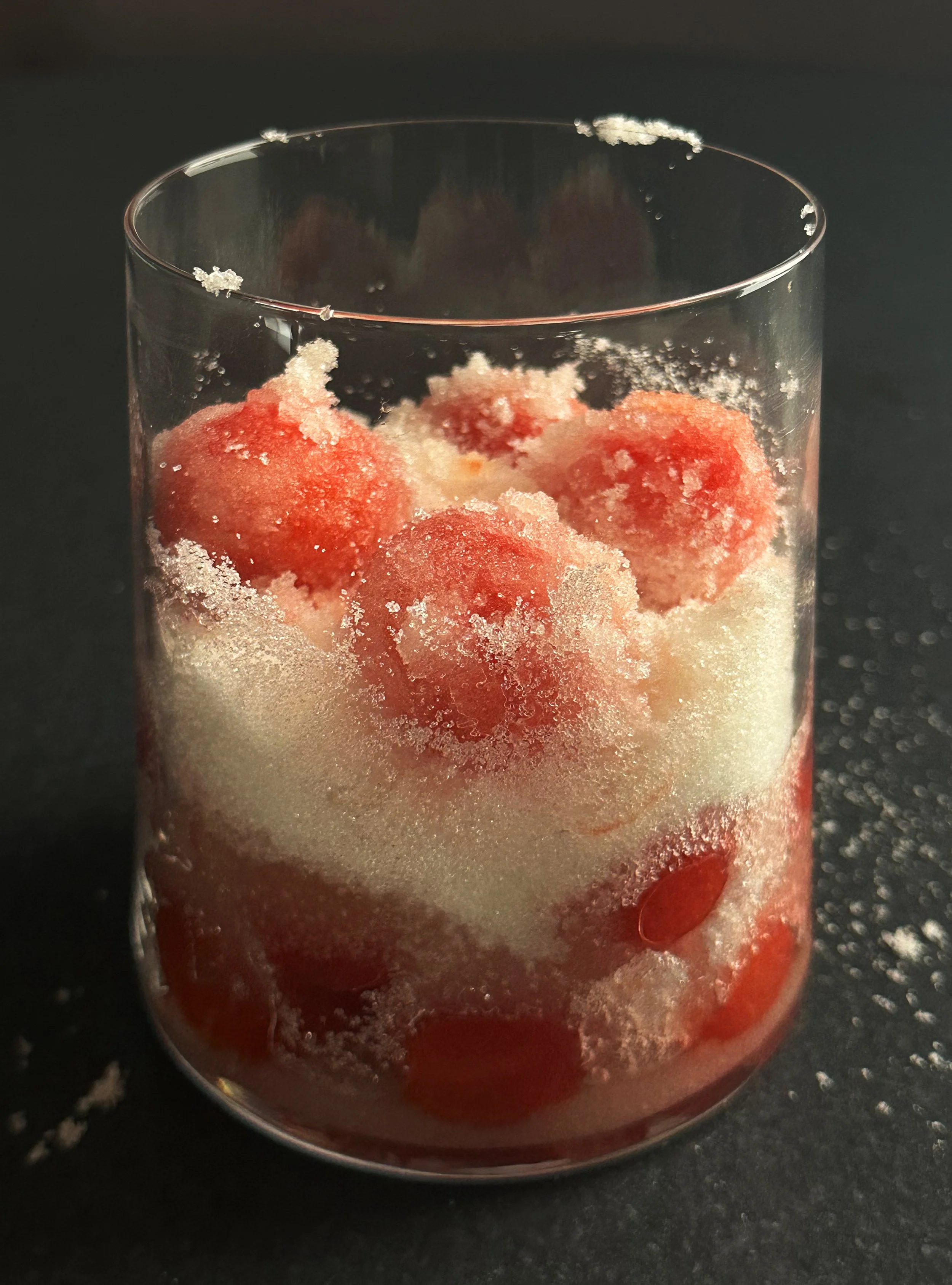While in the west we generally eat them in savoury dishes, this recipe really brings out the cocktail tomato’s fruity sweetness. Balanced with the late harvest funk of a Sherry and some savoury salt, the flavour combination is one of those intriguing ones that will keep you coming back for more.