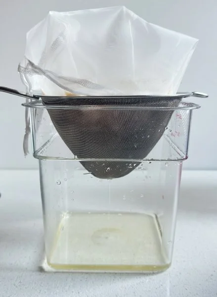 Strain mixture through doubled-up cheesecloth or a nut milk bag. You may need to strain twice to get a totally clear cocktail. The very first pour should begin gently to avoid pushing the liquid through the filter with force, which will result in a cloudy drink (if this happens, just add the cloudy liquid back to the bag to re-strain it before proceeding). Allow the straining to proceed without squeezing the bag or trying to hurry it along – it will take between 1 and 4 hours. The resultant liquid should be clear with a yellow tint.